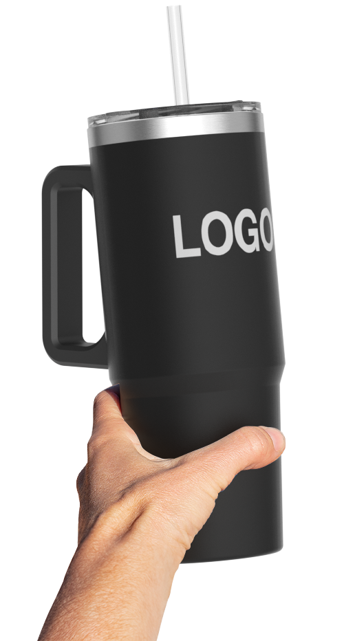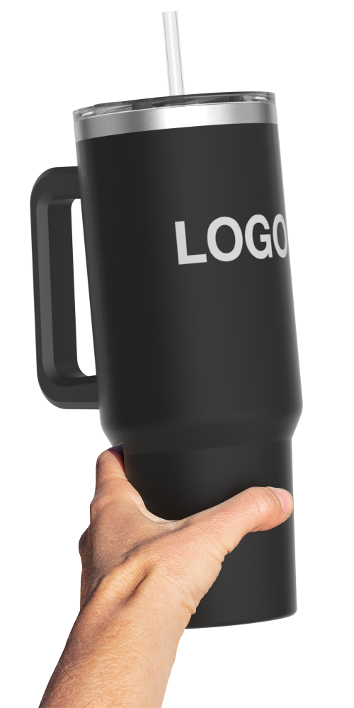 The Jumbo Travel Cup is a popular tumbler-style model that boasts double-wall insulation, a comfortable handle, secure sip lid and also a Tritan™ straw - known for its durability. The dedicated branding area is ready to be customised with your logo, slogan and more - all in precise detail. Contact us today for prices, express delivery times and samples.